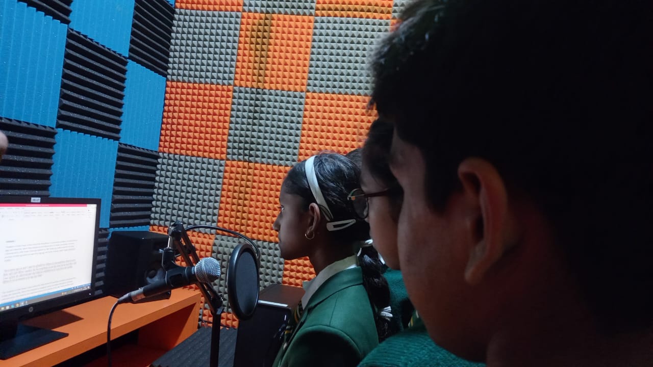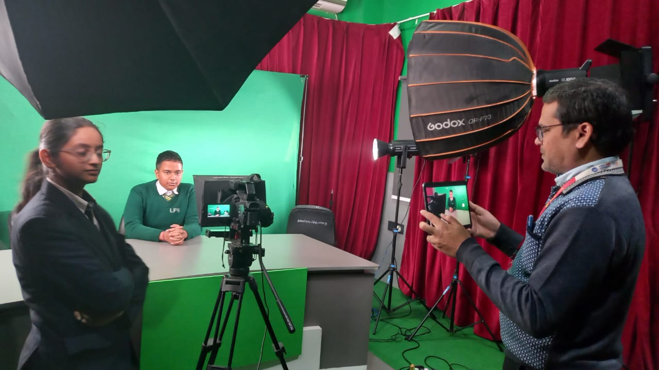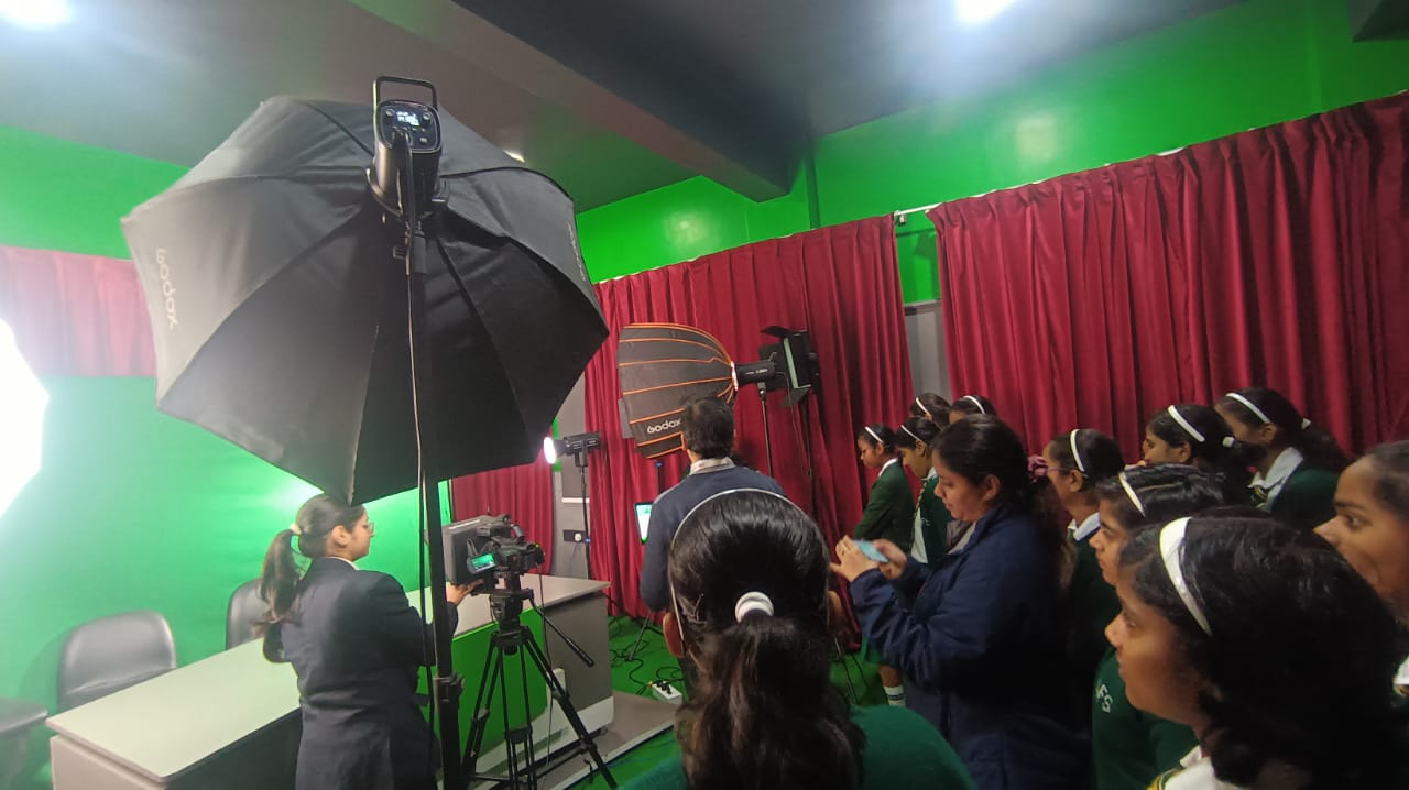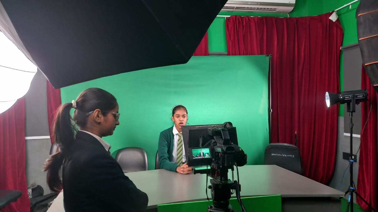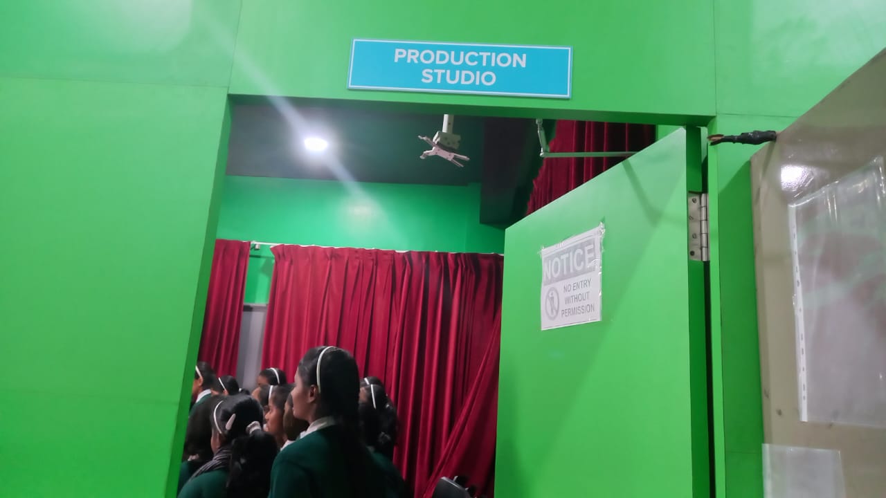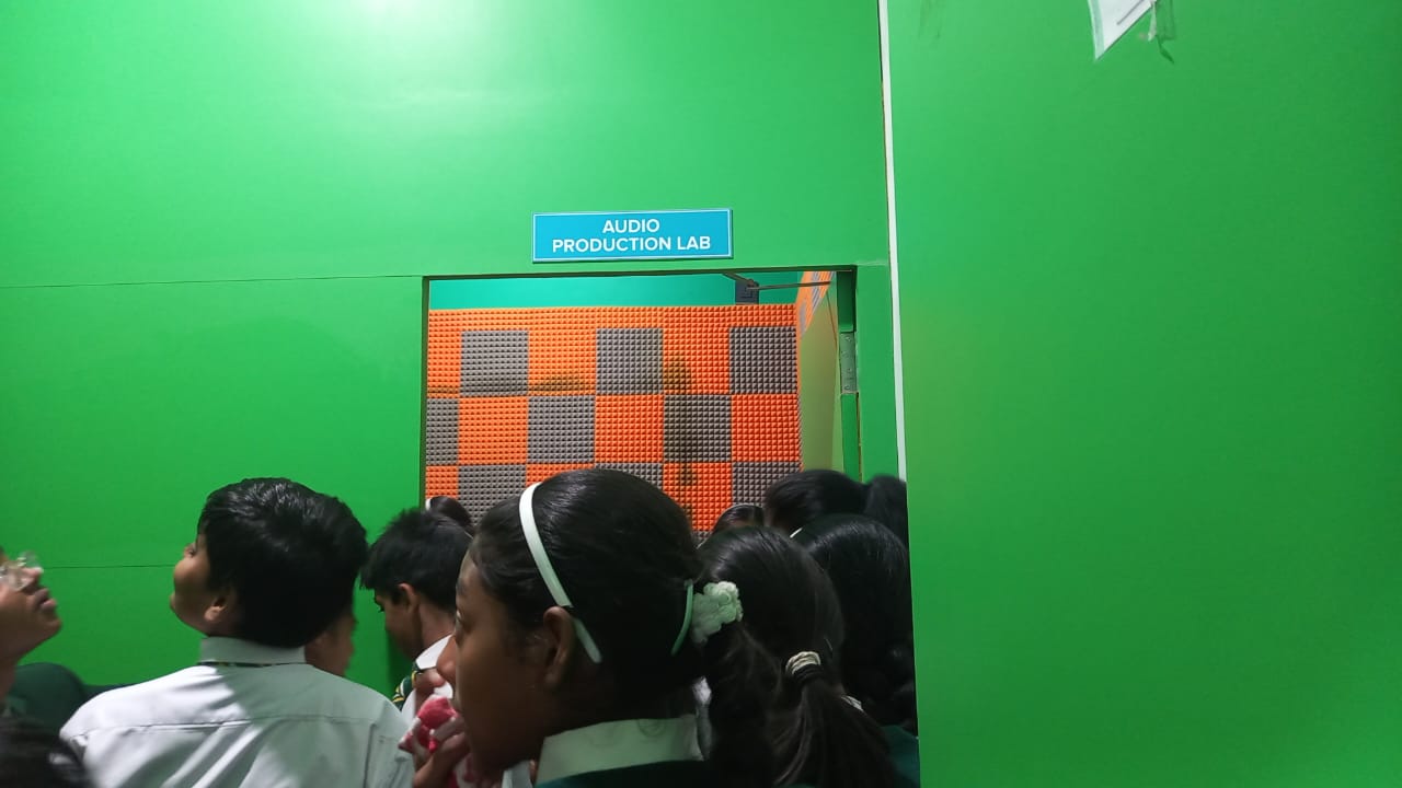 After a sumptuous snack, the students proceeded to the Production Studio and the Audio Production Lab–cum–PCR, where they had the exciting experience of playing the roles of radio jockeys and newsreaders, reporting news scripted on a teleprompter. The session offered them valuable insights into news reporting and news presentation on television.