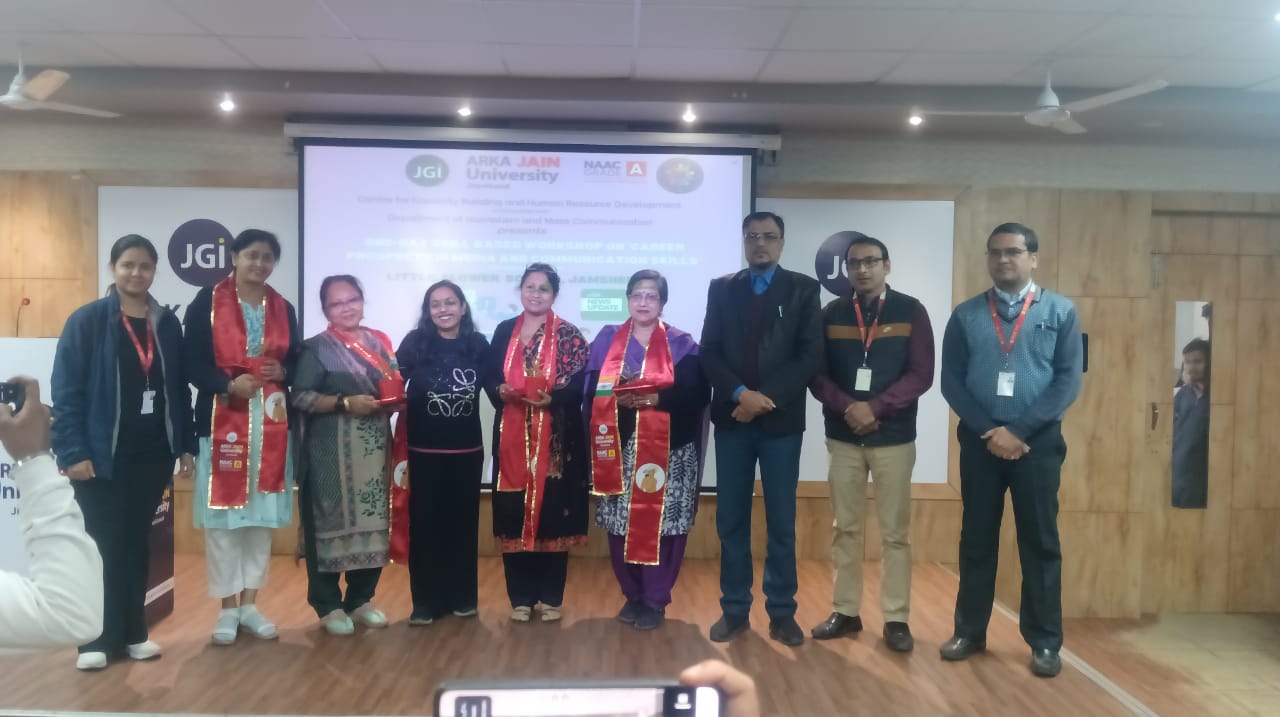 The students visited the Department of Journalism and Mass Communication at ARKA JAIN UNIVERSITY for an enriching and interactive workshop. Dr. Charu Wadhwa, Assistant Director, CCHRD, warmly welcomed the students and teachers. The accompanying teachers—Mrs. Gloria Wen, Mrs. Sandra Moss, Mrs. Ravinder Kaur, and Mrs. Mousumi Bhaduri—were felicitated by Dr. Rahul Amin, Assistant Dean, School of Humanities.